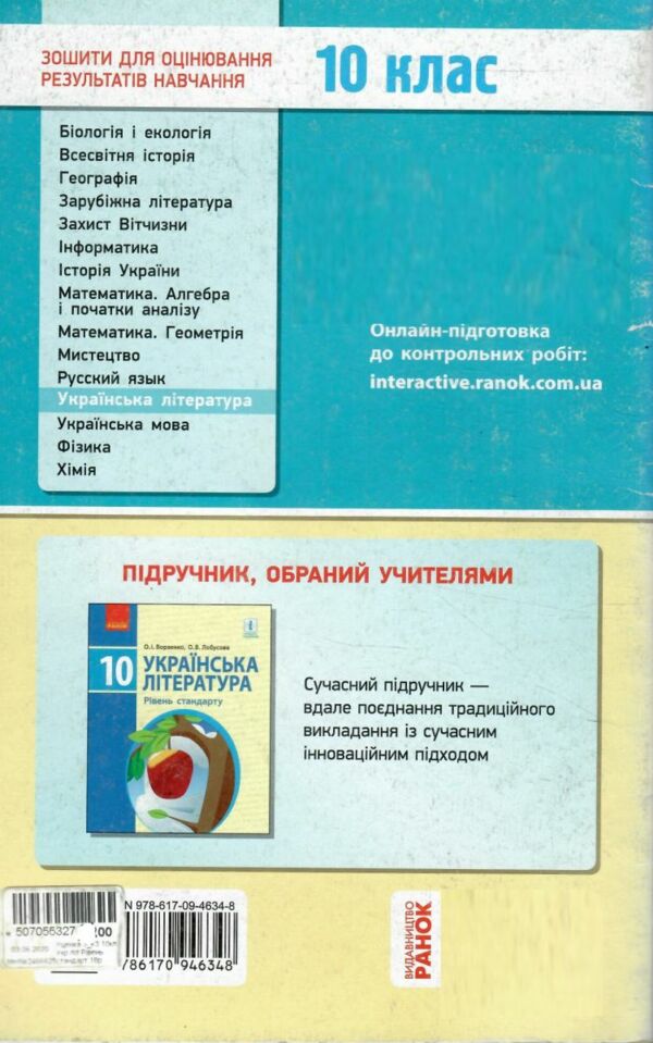 Уцінка зошит для контролю рівня знань 10кл Укр.літ Рівень стандарт (потерта обкладинка) "Ранок"