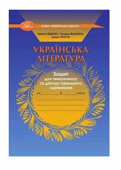 Таміла ЯЦЕНКО, Галина ІВАШИНА, Ірина ТРИГУБУКРАЇНСЬКА ЛІТЕРАТУРАЗошит для тематичного та діагностувального оцінювання Зошит укладено відповідно до чинної модельної навчальної програми «Українська література» для 7–9 класів закладів загальної середньої освіти (науковий керівник Т. О. Яценко) і підручника «Українська література. 8 клас» для закладів загальної середньої освіти (науковий керівник Т. О. Яценко).Запропоновано визначення індивідуальних навчальних цілей, подано різнорівневі запитання та завдання в тестовій формі (закритого й відкритого типів), творчі завдання, семестрові діагностувальні роботи відповідно до чотирьох груп навчальних результатів. Така система роботи сприятиме формуванню предметної (читацької) і ключових компетентностей восьмикласників / восьмикласниць