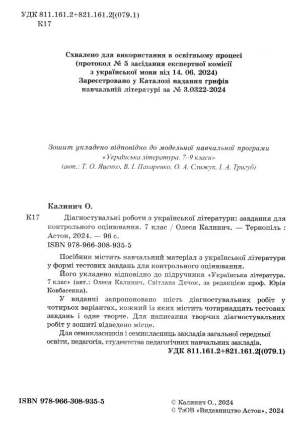 українська література 7 клас контрольне оцінювання