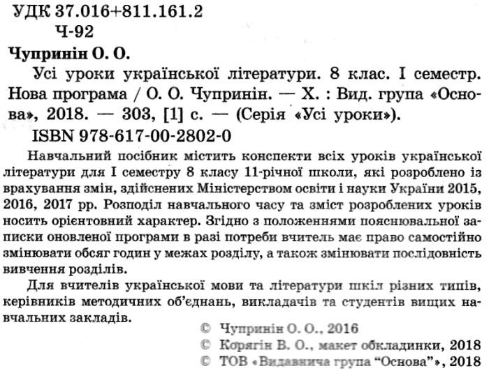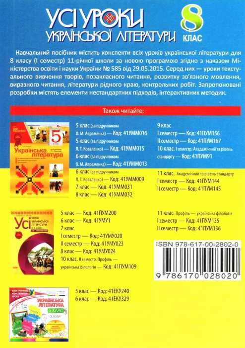 Навчальний посібник містить конспекти всіх уроків української літератури для I семестру 8 класу 11-річної школи за новою програмою згідно з наказом Міністерства освіти і науки України № 585 від 29.05.2015. Серед них уроки текстуального вивчення творів, позакласного читання, розвитку зв’язного мовлення, виразного читання, літератури рідного краю, контрольних робіт. Запропоновані розробки містять елементи нестандартних підходів, інтерактивних методик.