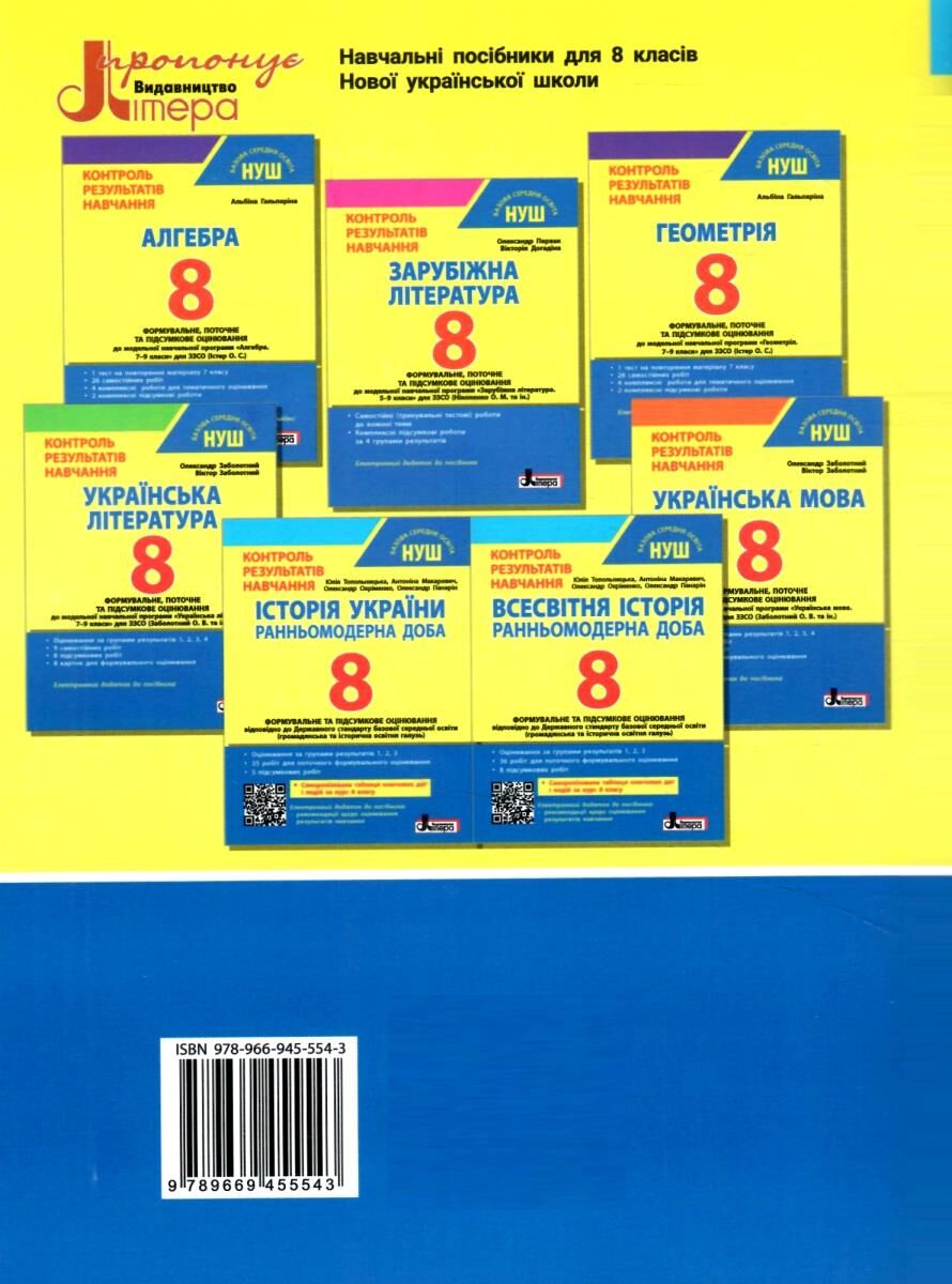 НУШ 8 клас. Історія України. Тестовий контроль результатів навчання + Оцінювання за групами результатів. Топольницька Ю. Цей посібник призначений для виконання письмових робіт з метою виявлення рівня опанування учнями основних предметних компетентностей та розвитку основних складових історичної свідомості. Збірник складений відповідно до чинних навчальних програм з історії України для 8 класу закладів загальної середньої освіти і може бути використаний із будь-якими підручниками та навчальними посібниками.