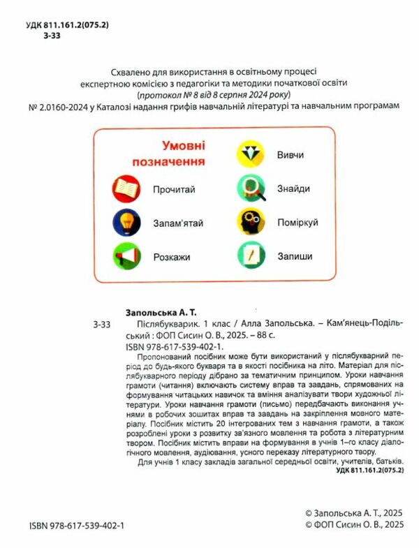 Пропонований посібник може бути використаний у післябукварний пеpiод до будь-якого букваря та в якості посібника на літо. Матеріал для післябукварного періоду дібрано за тематичним принципом. Уроки навчання грамоти (читання) включають систему вправ та завдань, спрямованих на формування читацьких навичок та вміння аналізувати твори художньої літератури. Уроки навчання грамоти (письмо) передбачають виконання учнями в робочих зошитах вправ та завдань на закріплення мовного матеpiaлy. Посібник містить 20 інтегрованих тем з навчання грамоти, а також розроблені уроки з розвитку зв'язного мовлення та робота з літературним твором. Посібник містить вправи на формування в учнів 1-го класу діалогічного мовлення, аудіювання, усного переказу літературного твору.
