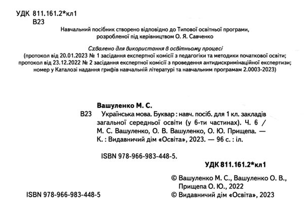 НУШ-2 1 клас. Буквар. Українська мова. (у 6-х частинах). Частина 6. Вашу плівку М. С.Цей навчальний посібник із шести частин - безперечно нове слово у підручникотворенні. Уперше дбайливо й цікаво поєднано в одній книжці практичний матеріал з навчання читання і письма.Цей посібник створений для того, щоб дитина захотіла читати і писати й відчула радість від того, що вміє це робити.І-ша частина посібника призначена для добуквеного періоду навчання грамоти,2-5 частини забезпечують буквений період,6-та – післябуквений період навчання.Орієнтований на дітей, які мають різний рівень дошкільної читацької підготовки: для тих учнів/учениць, які навчаються читати, у матеріалі для читання використовуються тільки вивчені літери, також у посібнику вміщено тексти і завдання для дітей, які певною мірою вміють читати, щоб створити умови для організації на уроці диференційованої роботи з різними групами учнів/учениць.Родзинкою посібника є використання нових, цікавих сучасним першокласникам текстів, компетентнісно орієнтованих завдань та завдань функціонального характеру. Автори звертаються до каналів сприйняття дитиною світу, залучають емоційну та образну пам'ять, щоб граючи, без настанов і примусу сформувати в учнів психологічну готовність до читання і письма.Посібник звернеться до дитини, заговорить і заспіває разом з нею. У QR-кодах із посиланнями на аудіофайли вміщено тексти для слухання, озвучені професійними дикторами, мовлення яких стане взірцем для учнів/учениць. Після завершення слухання відбувається робота над виконанням завдань, які спрямовані на перевірку розуміння усної інформації.Щоб маленькі школярі подолали існуючий у багатьох з них бар'єр у навчанні письма, автори пропонують писати спочатку друковані букви. Особливу увагу в посібнику приділено формуванню навички письма у ліворуких дітей: зразок букви в кінці рядка на той випадок, якщо він/вона закриватиме рукою зразок, який розташований на початку рядка. Над буквами нанесено стрілочку, яка нагадує дітям (особливо лівшам) звідки починати писати букву, який елемент у букві пишеться першим.З посібником зручно буде працювати й учителям: ураховуючи рівень розвитку читацьких і мовленнєвих умінь учнів класу, педагог самостійно визначає обсяг і частотність виконання тих чи інших завдань. Завдання до текстів подано в самому посібнику, але дрібним шрифтом, призначеним для дорослого читача.Ми намагалися створити не просто навчальний посібник, а дитячу книжку з яскравими малюнками, мовними цікавинками, міцним патріотичним підґрунтям. Нехай вона, турботливо тримаючи за руку, веде дитину у світ української мови!