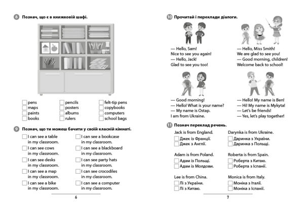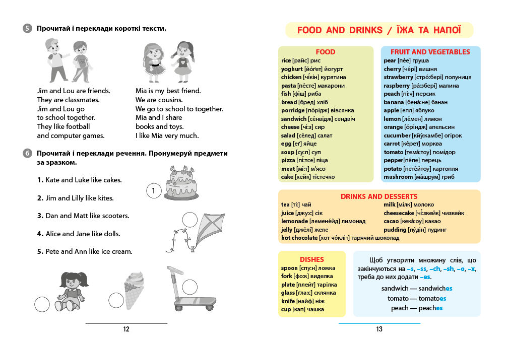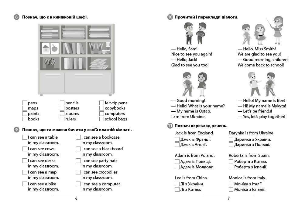 "На сторінках цього посібника розміщено завдання, виконуючи які дитина закріпить знання про числа від 1 до 20, членів родини, пори року й одяг, погоду, диких і свійських тварин, фрукти й овочі, просте меню, частини тіла, шкільне приладдя і меблі, а також час на годиннику та назви дій. Посібник побудовано з урахуванням дитиноцентризму, доступності й практичної спрямованості змісту. Видання відповідає Типовим освітнім програмам НУШ і стане в пригоді як додатковий тренажер на уроках, а також буде корисним для занять удома самостійно та з батьками. Книжка містить розмаїті завдання, що розвиватимуть уяву, мислення і дрібну моторику, стимулюватимуть зацікавленість дитини в навчанні.