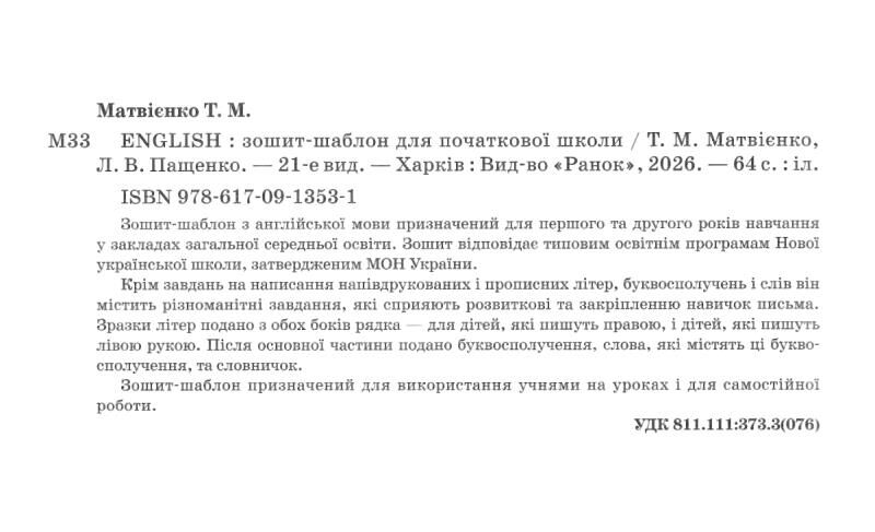 Зошит-шаблон з англійської мови призначений для першого та другого років навчання у закладах загальної середньої освіти. Зошит відповідає типовим освітнім програмам Нової української школи, затвердженим МОН України.