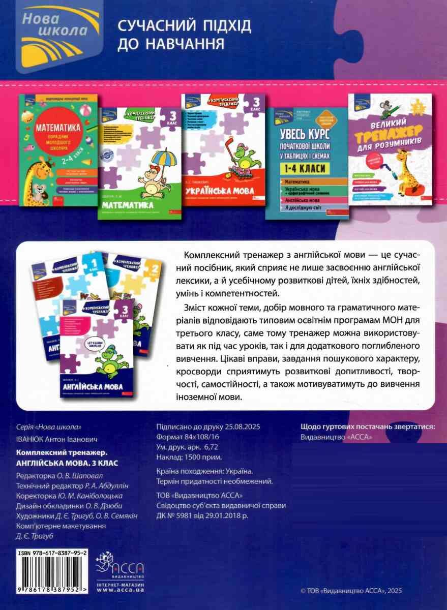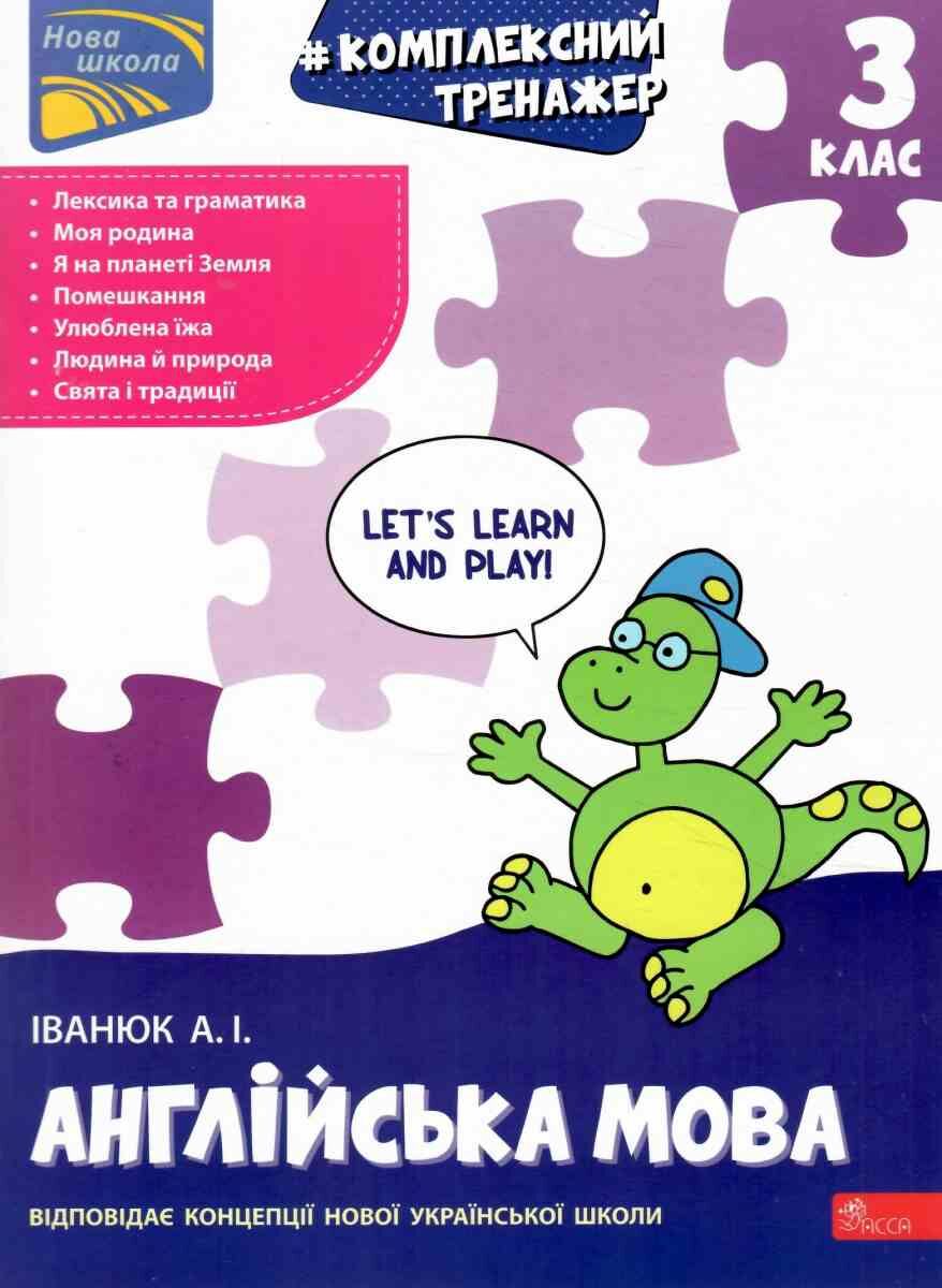 Комплексний тренажер з англійської мови – це сучасний посібник, який сприяє не лише засвоєнню англійської мови, а й всебічному розвиткові дітей, їх здібностей, вмінь та компетентностей. Зміст кожної теми, добір мовного та граматичного матеріалу відповідають типовим освітнім програмам МОН для третього класу, саме тому тренажер може використовуватись як під час уроків, так і для додаткового поглибленого вивчення. Представлені вправи, завдання пошукового характеру, кросворди, розмальовки, ігри, лабіринти сприятимуть розвитку допитливості, творчості, самостійності, а також мотивуватимуть до вивчення іноземної мови. Завдяки тренажеру школярі опанують граматику англійської мови, а також наступні лексичні теми: Моя родина. Я на планеті Земля. Помешкання. Свята і традиції. Улюблена їжа. Людина і природа.