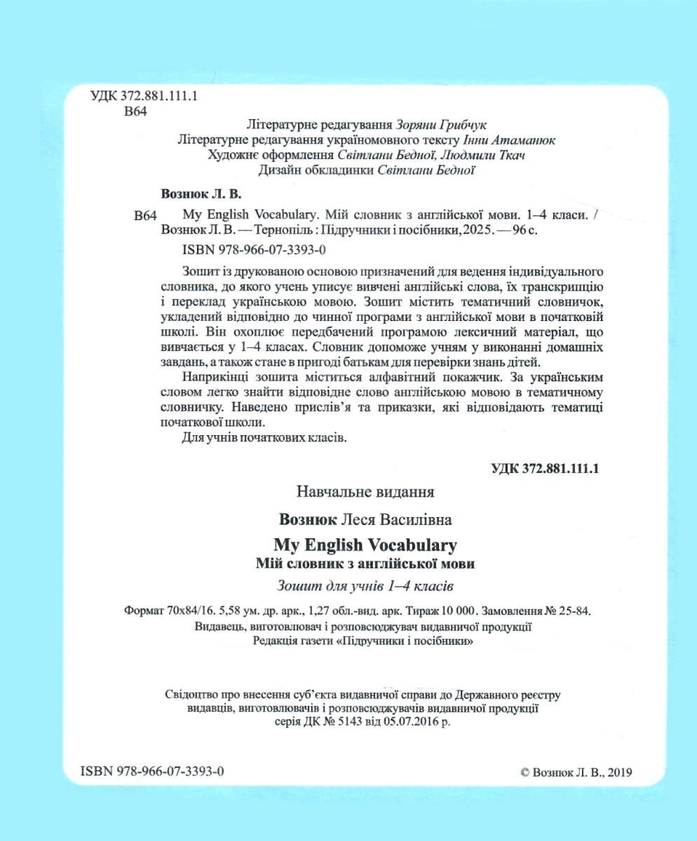 Зошит з друкованою основою призначений для ведення індивідуального словника, до якого учень уписує вивчені англійські слова, їх транскрипцію і переклад українською мовою. Зошит містить тематичний словничок, складений відповідно до чинної програми з англійської мови у початковій школі. Він охоплює передбачений програмою лексичний матеріал, що вивчається у 1-4 класах. Словник допоможе учням у виконанні домашніх завдань, а також стане у пригоді батькам для перевірки знань дітей.