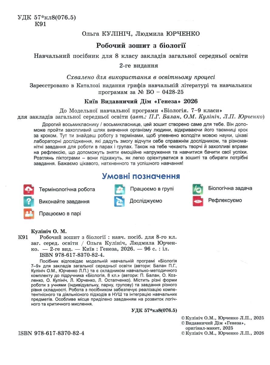 Посібник відповідає модельній навчальній програмі «Біологія 7–9» для закладів загальної середньої освіти (автори: Балан П,Г. Кулініч О.М. Юрченко Л.П) та є складником навчально-методичного комплекту до підручника «Біологія, 8 кл.» (автори: П. Балан, О. Козленко, Л. Остапченко, О. Кулініч, Л. Юрченко). Містить різні форми роботи з учнями (індивідуальну, парну, групову) та завдання різного рівня складності. Робота з посібником забезпечує реалізацію компетентнісного та діяльнісного підходів в НУШ та інтеграцію навчальних предметів. Особливе місце приділено завданням на розвиток логічного та критичного мислення. Робочий зошит спрямований на формування основних груп загальних результатів навчання у природничій освітній галузі. Для забезпечення дослідницької діяльності учнів у посібнику розміщено інструктивні картки для виконання лабораторних досліджень та практикумів. Інформація, з якою мають працювати здобувачі освіти, представлена у вигляді таблиць, схем, діаграм, світлин тощо. Для усвідомлення закономірностей природи є низка завдань практичного спрямування.