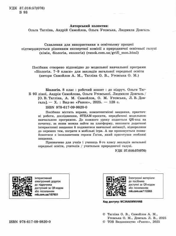 Цей робочий зошит укладено відповідно до параграфів підручника й доповнює його, надаючи можливість застосувати на практиці отримані знання. Тут є різноманітні компетентнісні завдання, творчі задачки й навіть невеликі експерименти! Зошит стане надійним супутником під час роботи на уроці та при виконанні домашніх завдань, допоможе учням і ученицям пізнати біологію та перетворить навчання на захопливу подорож!