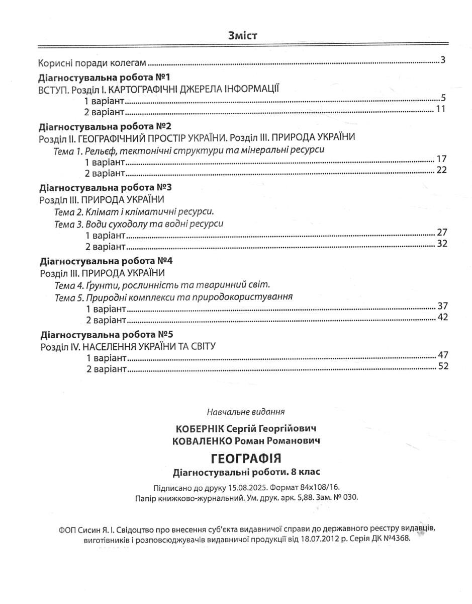 «Географія: Діагностувальні роботи. 8 клас» (автор С. Г. Кобернік) - це посібник, який допоможе учням систематично оцінювати свої досягнення в навчанні та підготуватися до семестрових і річних оцінок з географії. У книзі зібрано ряд діагностувальних завдань, що дозволяють учням оцінити свої знання за основними критеріями: дослідження природи, пошук та обробка інформації, а також усвідомлення закономірностей природних явищ. Це видання також підтримує вчителів у проведенні тематичних та поточних оцінок, що враховують динаміку навчальних досягнень кожного учня. Діагностувальні роботи допомагають учням засвоїти важливі навички географічного аналізу і підвищити ефективність навчального процесу.