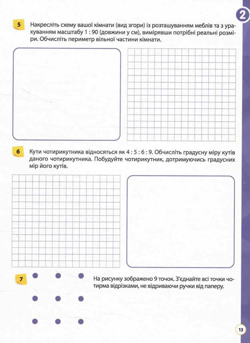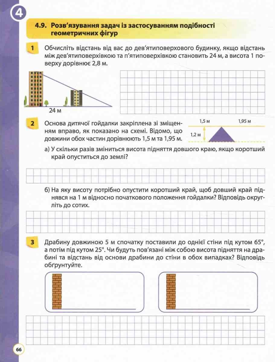 Ключові особливості робочого зошита:· чітка та логічна структура. Матеріал поділено на розділи, які відповідають основним темам навчальної програми. Кожен розділ містить завдання, які ускладнюються від простого до складного, забезпечуючи учням можливість послідовного засвоєння матеріалу та розвитку необхідних навичок.· практична спрямованість завдань. У зошиті велика кількість різноманітних вправ. Особлива увага приділяється розв'язуванню задач практичного змісту, які допомагають учням зрозуміти зв'язок математики з реальним життям та розвинути навички моделювання. Пропонуються задачі, які потребують застосування геометричних знань у нестандартних умовах.· корисні підказки та основні формули. Це дозволяє не лише закріпити теоретичні знання, але й сформувати вміння застосовувати їх на практиці.· акцент на розвитку математичного мислення. Завдання у зошиті потребують від учнів аналізу, порівняння, узагальнення та творчого застосування знань. Це сприяє розвитку логічного мислення, просторової уяви та вміння розв'язувати нестандартні задачі. Розвивають логічне мислення через доведення геометричних тверджень.· зручний формат та оформлення. Зошит має достатньо місця для виконання завдань, що дозволяє учням працювати безпосередньо в зошиті, не витрачаючи час на переписування умов. Чіткі інструкції та приклади полегшують самостійну роботу учнів та роблять зошит зручним у використанні як в класі, так і вдома.