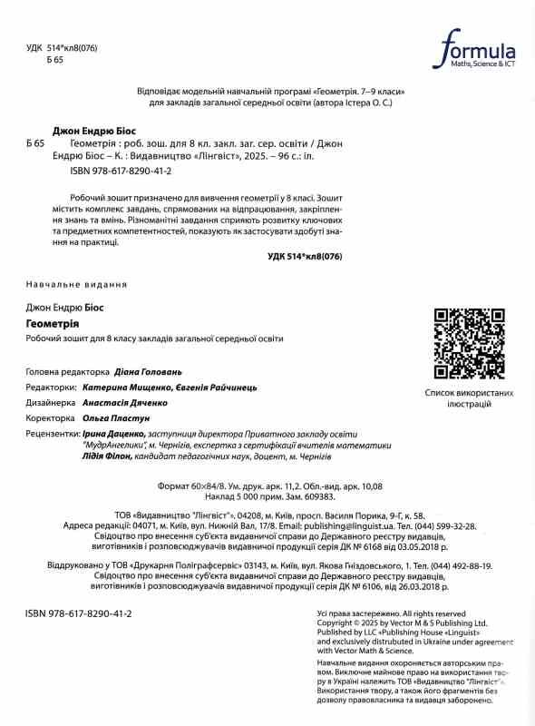 Робочий зошит з геометрії – це ексклюзивний компонент до підручника Джона Ендрю Біоса «Геометрія. 8 клас» від українського бренду Formula та міжнародного видавництва Vector. Зошит відповідає вимогам Сінгапурської навчальної програми з математики та допомагає учням досягти рівня математичної обізнаності, який сприяє їхнім можливостям у повсякденній діяльності.