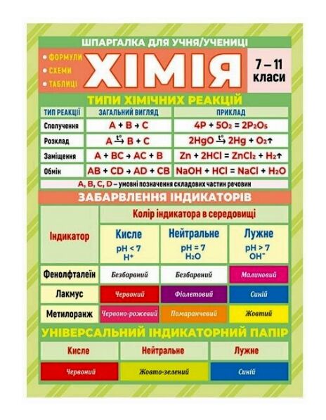 1. Новинка від Ранок. Наочні посібники шпаргалка з хімії для учнів 7-11 класів (з правилами,формулами, таблицями)