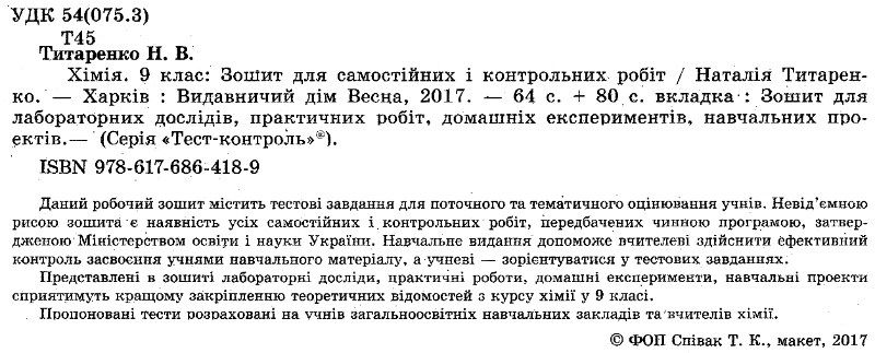 титаренко тест-контроль 9 клас хімія купити ціна купить цена "Весна"
