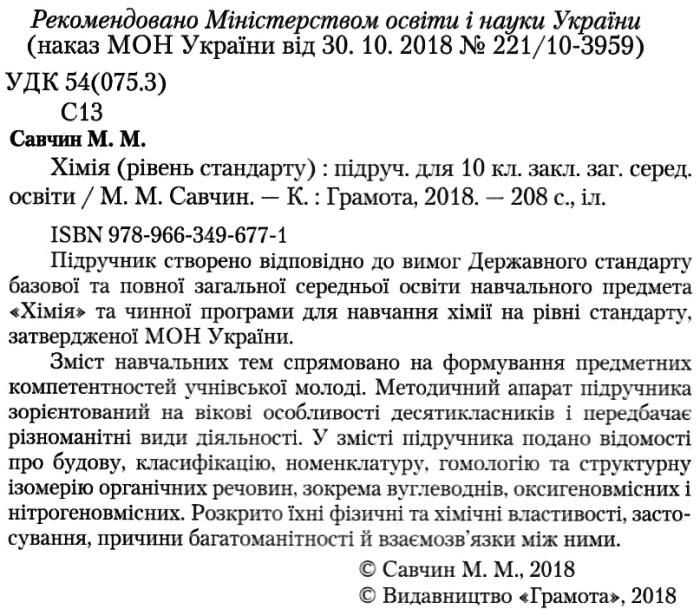 савчин хімія 10 клас підручник рівень стандарту