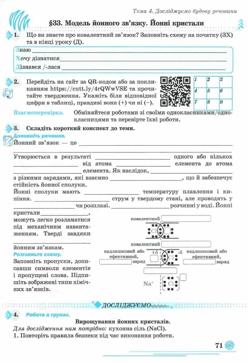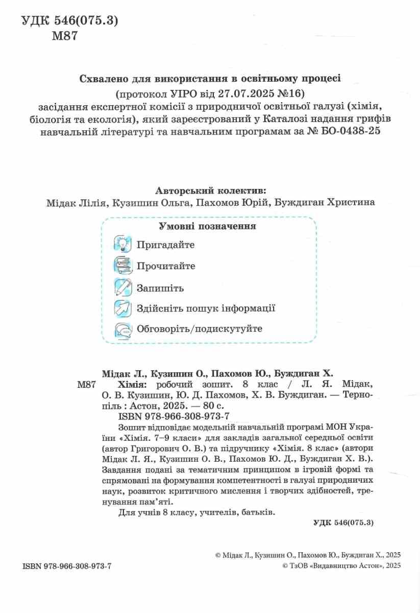 Зошит відповідає модельній навчальній програмі МОН України «Хімія. 7–9 класи» для закладів загальної середньої освіти (автор Григорович О. В.) та підручнику «Хімія. 8 клас» (автори Мідак Л. Я., Кузишин О. В., Пахомов Ю. Д., Буждиган Х. В.). Завдання подані за тематичним принципом в ігровій формі та спрямовані на формування компетентності в галузі природничих наук, розвиток критичного мислення і творчих здібностей, тренування пам’яті.Для учнів 8 класу, учителів, батьків.