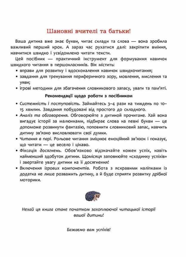 Посібник створено для учнів 1 класу, які вже знають букви і опанували читання складів і простих слів. Тепер час навчитися читати прості речення і невеличкі тексти. У книзі ви знайдете багато цікавих завдань, які допоможуть дитині не лише навчитися добре читати, розвинути артикуляційний апарат, пам’ять, мислення, активізувати творчі здібності, а й зроблять процес навчання захопливою грою.