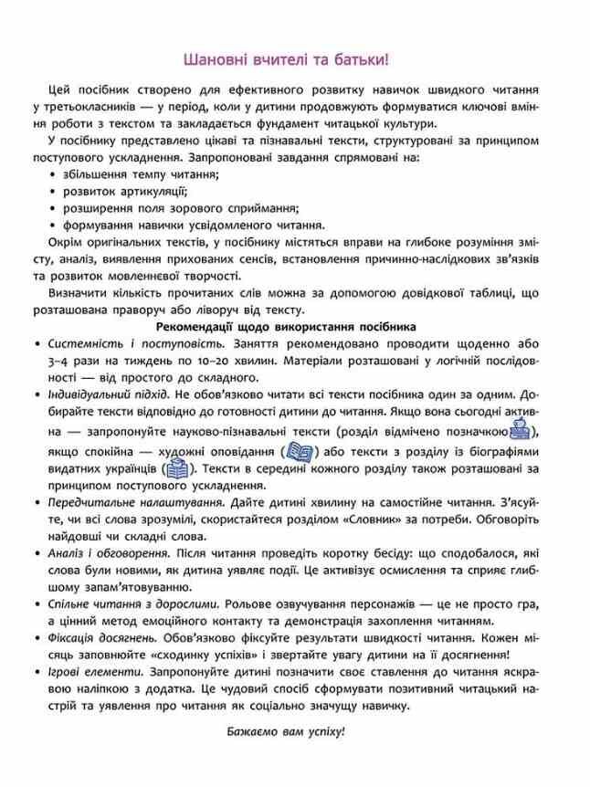Посібник створено для учнів 3 класу, які прагнуть удосконалити навички швидкого і свідомого читання. Поступове ускладнення оригінальних текстів сприяє підвищенню темпу читання, розвитку артикуляції та розширенню зорового сприймання. Завдання на глибоке розуміння прочитаного, аналіз змісту, встановлення логічних зв’язків і виявлення прихованих сенсів допомагають сформувати у дитини навички критичного мислення. Творчі вправи мотивують до фантазування, переосмислення тексту та мовленнєвого розвитку.