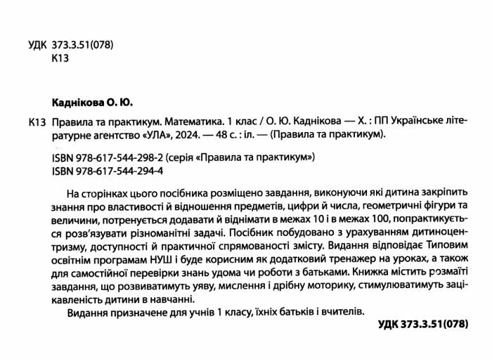 "На сторінках цього посібника розміщено завдання, виконуючи які дитина закріпить знання про властивості й відношення предметів, цифри й числа, геометричні фігури та величини, потренується додавати й віднімати в межах 10 і в межах 100, попрактикується розв’язувати різноманітні задачі. Посібник побудовано з урахуванням дитиноцентризму, доступності й практичної спрямованості змісту. Видання відповідає Типовим освітнім програмам НУШ і стане в пригоді як додатковий тренажер на уроках, а також буде корисним для занять удома самостійно та з батьками. Книжка містить розмаїті завдання, що розвиватимуть уяву, мислення і дрібну моторику, стимулюватимуть зацікавленість дитини в навчанні.