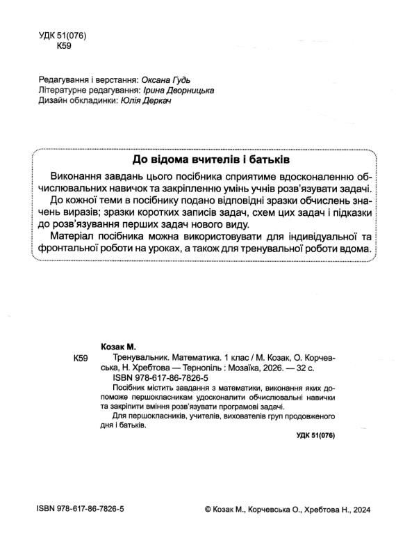 Посібник містить завдання з математики, виконання яких допоможе першокласникам удосконалити обчислювальні навички та закріпити вміння розвʼязувати програмові задачі.