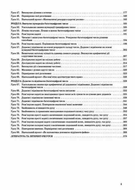 Посібник містить орієнтовне календарно-тематичне планування та розробки уроків математики у 4-му класі Нової української школи, складені відповідно до вимог нового Державного стандарту початкової освіти (2018) за Типовою освітньою програмою авторського колективу під керівництвом О. Я. Савченко.