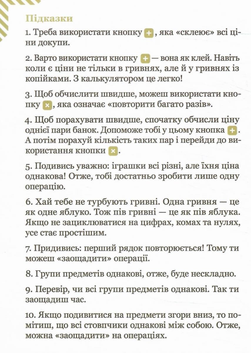 Тож цей посібник пропонує нестандартний і сучасний підхід до навчання математики — тимчасове використання калькулятора. Це допоможе учням зосередитися на суті задачі замість механічних розрахунків і сприятиме розвиткові логічного мислення та розумінню структури задач. Опанувавши розв’язування задач різних типів, діти легко повернуться до ручних обчислень — але вже з розумінням, а не сліпим виконанням дій.