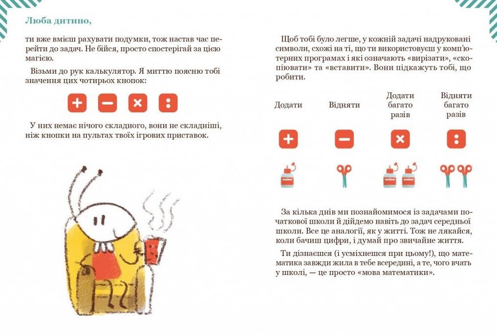 Тож цей посібник пропонує нестандартний і сучасний підхід до навчання математики — тимчасове використання калькулятора. Це допоможе учням зосередитися на суті задачі замість механічних розрахунків і сприятиме розвиткові логічного мислення та розумінню структури задач. Опанувавши розв’язування задач різних типів, діти легко повернуться до ручних обчислень — але вже з розумінням, а не сліпим виконанням дій.