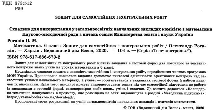 Роганін Математика 6 клас Тест-контроль купити "Весна"