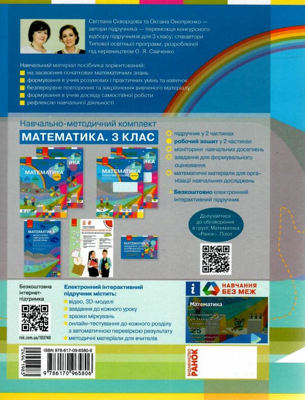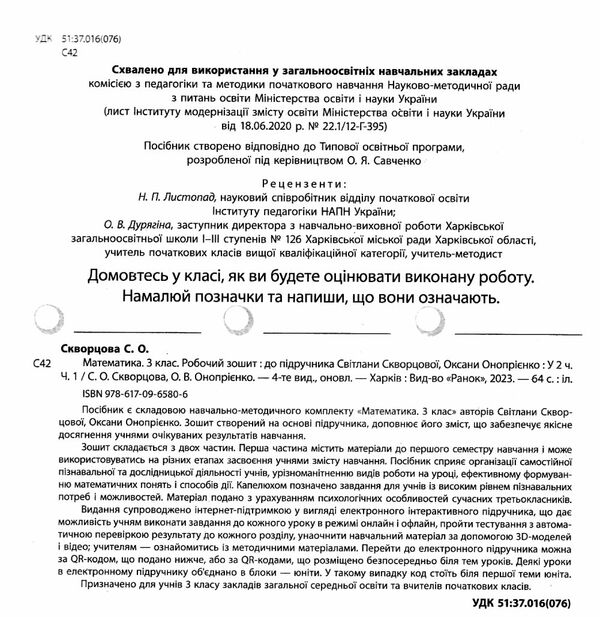 Посібник є складовою навчально-методичного комплекту «Математика. 3 клас» авторів Світлани Скворцової, Оксани Онопрієнко. Зошит створений на основі підручника, доповнює його зміст, що забезпечує якісне досягнення учнями очікуваних результатів навчання. Зошит складається з двох частин. Перша частина містить матеріали до першого семестру навчання і може використовуватись на різних етапах засвоєння учнями змісту навчання. Посібник сприяє організації самостійної пізнавальної та дослідницької діяльності учнів, урізноманітненню видів роботи на уроці, ефективному формуванню математичних понять і способів дії. Капелюхом позначено завдання для учнів з високим рівнем пізнавальних потреб і можливостей. Матеріал подано з урахуванням психологічних особливос тей сучасних третьокласників. Призначено для учнів 3 класу закладів загальної середньої освіти і вчителів початкових класів
