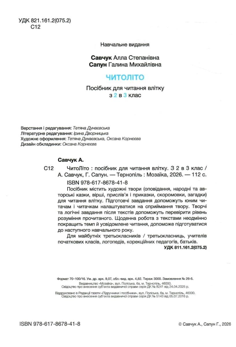 Посібник містить художні твори (оповідання, народні та авторські казки, вірші, прислівʼя і приказки, скоромовки, загадки) для читання влітку. Підготовчі завдання допоможуть юним читачам і читачкам налаштуватися на сприймання твору. Творчі та логічні завдання після текстів допоможуть перевірити рівень розуміння прочитаного. Щоденна робота з текстами неодмінно покращить темп й усвідомлене читання, допоможе підготуватися до наступного начального року. Для майбутніх третьокласників / третьокласниць, учителів початкових класів, логопедів, корекційних педагогів, батьків.