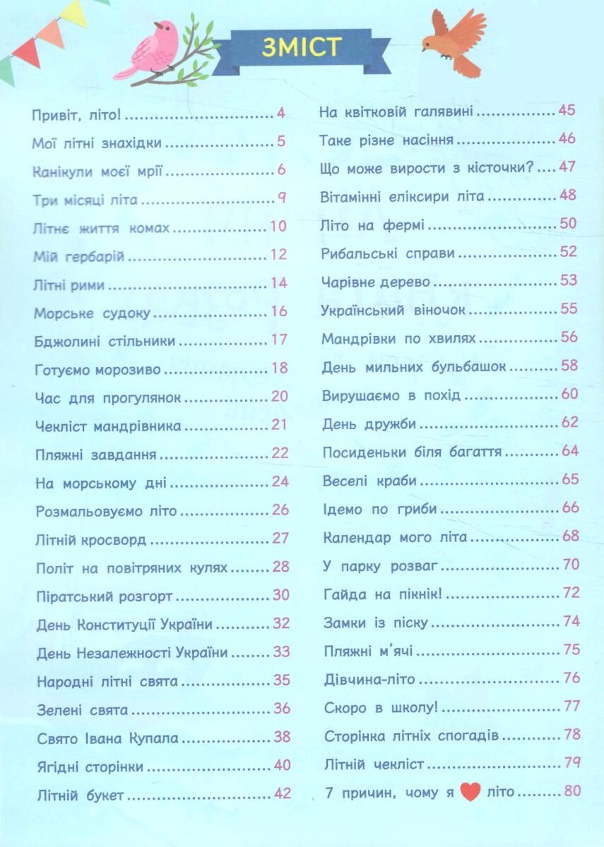 Книга містить 80 сторінок із захопливими завданнями, які дитина виконуватиме впродовж усіх літніх канікул. Водночас отримає нові знання, розвиватиме логіку, увагу, дрібну моторику й формуватиме художній смак. Приємне та корисне доповнення — 126 наліпок.