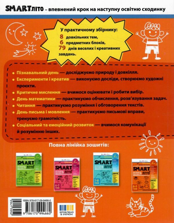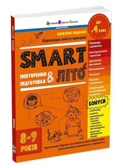 SMARTліто. Іду у 4 клас - практичний збірник з дослідницькими завданнями, що розвивають впевненість і вправність. Природа і довкілля, експерименти і креатив, критичне мислення і математика, письмо і мовлення, читання, соціальний та емоційний розвиток - 63 дні креативних завдань на повторення та підготовку до наступного класу. А щоб було ще цікавіше, ми підготували й бонуси: досягатор, наліпки, записничок для мандрівок та рекомендації книг для читання і слухання.