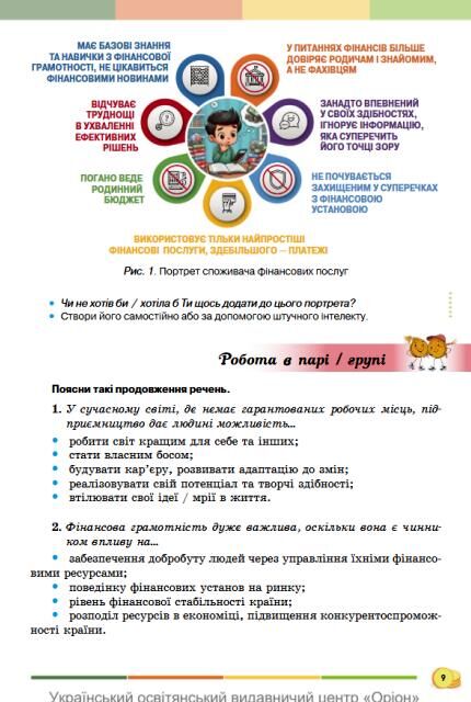 Підручник для 8 класу (авторка А.В. Кузнєцова) створений відповідно до вимог Нової української школи та спрямований на формування у підлітків практичних навичок фінансової обізнаності, економічного мислення й підприємницької ініціативи. Посібник подає складні фінансові поняття простою й доступною мовою, поєднуючи теорію з життєвими прикладами, інтерактивними завданнями та кейсами. Учні вчаться планувати бюджет, розуміти ціну грошей, ухвалювати економічно виважені рішення та орієнтуватися в сучасному світі бізнесу. Цей підручник - не лише про гроші, а про відповідальність, креативність і вміння перетворювати ідеї на реальні дії.