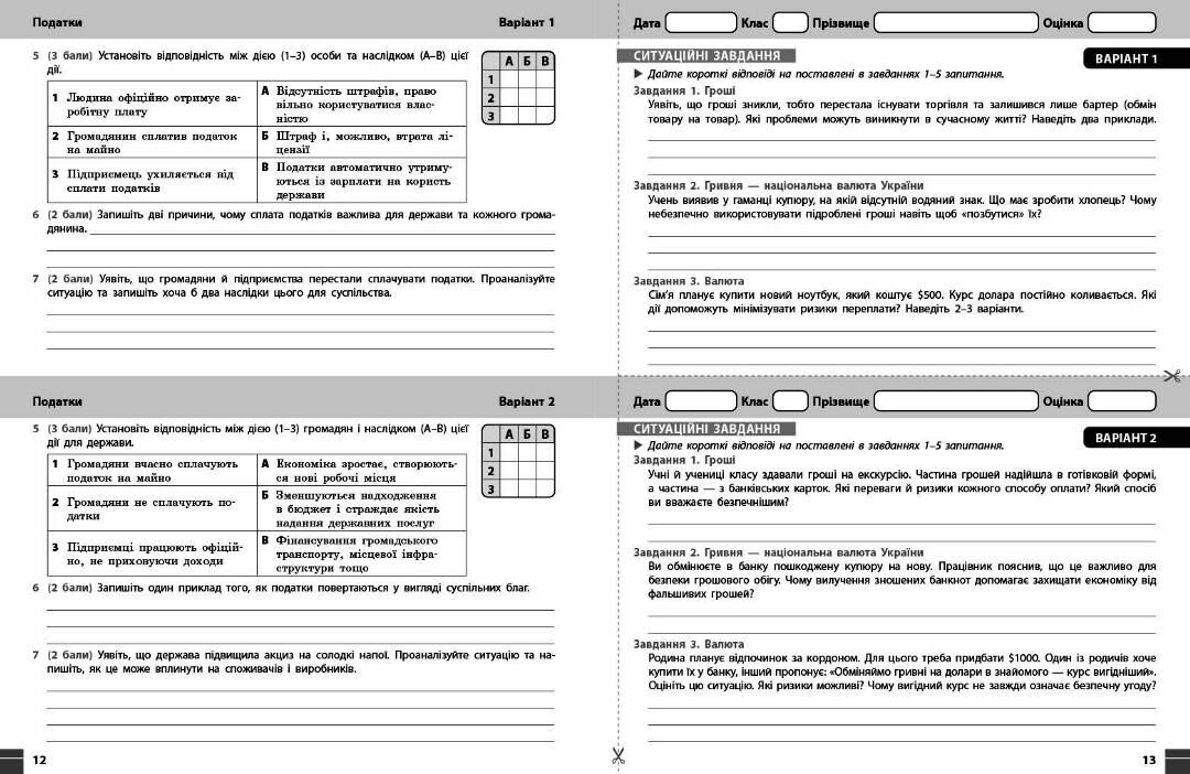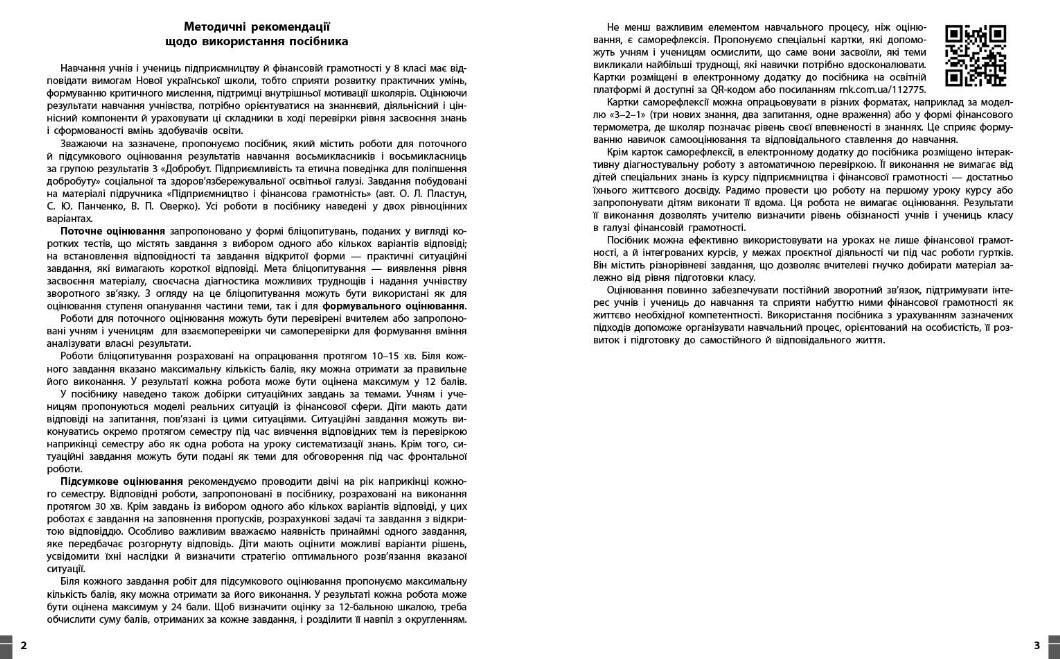 Посібник містить роботи для поточного та підсумкового оцінювання, а також ситуаційні задачі з підприємництва і фінансової грамотності у 8 класі НУШ. Картки для саморефлексії розміщено в інтерактивному електронному додатку, доступному за QR-кодом або посиланням. Призначено для учнів і учениць 8 класу закладів загальної середньої освіти, вчителів і вчительок підприємництва і фінансової грамотності.