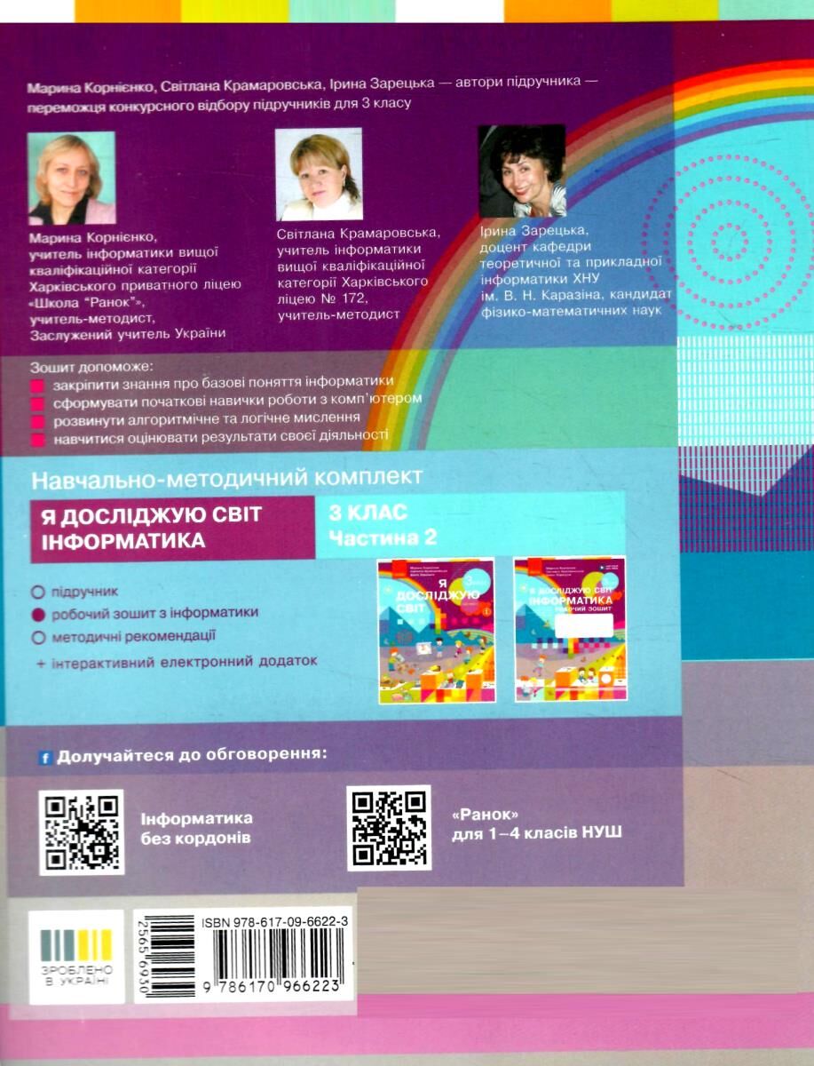 «Я досліджую світ Інформатика 3 клас» - робочий зошит створений до підручника М. Корнієнко і відповідає усім його темам. Зошит допоможе закріпити та поглибити знання з предмету. Сторінка з кожною темою гарно структурована і має привабливий для дитини зовнішній вигляд. Для кожного уроку передбаченні вправи на вивчення та закріплення матеріалу теми, розділ з підготовкою до практичного завдання, розділ з цікавими задачами, а також розділ для підсумовування пройденого матеріалу. «Інформатика 3 клас» робочий зошит Корнієнко містить завдання на інтелектуальну розминку та фізкультхвилинку до кожного уроку. Вправи на фізкультхвилинку завантажуються за допомогою QR коду. Також окремим блоком винесенні основні визначення теми, які необхідно запам’ятати. Кожна тема уроку супроводжується онлайн-завданнями, які стають доступними завдяки QR-коду.