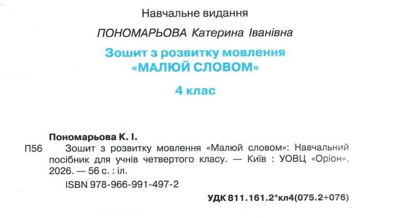 Зошит з розвитку мовлення 4 клас Малюю словом до підручника К. Пономарьової НУШ Оріон. Навчальний посібник для учнів 4-го класу.