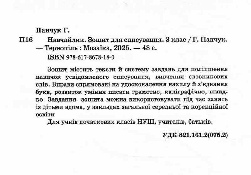 Зошит містить тексти й систему завдань для поліпшення навичок усвідомленого списування, вивчення словникових слів. Вправи спрямовані на удосконалення нахилу з’єднання букв, розвиток уміння писати грамотно, каліграфічно, швидко. Завдання зошита можна використовувати під час занять із дітьми вдома, у закладах загальної середньої та корекційної освіти.