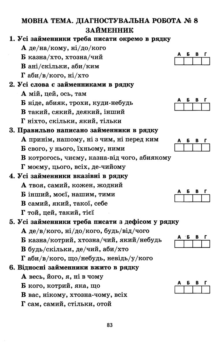 Посібник містить навчальний матеріал з української мови у формі тестових завдань для контрольного оцінювання.