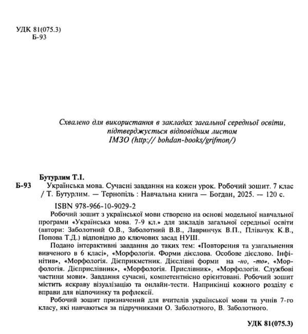 Робочий зошит з української мови створено на основі модельної навчальної програми «Українська мова. 7-9 кл.» для закладів загальної середньої освіти (автори: Заболотний О.В., Заболотний В.В., Лавринчук В.П., Плівачук К.В., Попова Т.Д.) відповідно до ключових засад НУШ. Подано інтерактивні завдання до таких тем: «Повторення та узагальнення вивченого в 6 класі», «Морфологія. Форми дієслова. Особове дієслово. Інфінітив», «Морфологія. Дієприкметник. Дієслівні форми на -но, -то», «Морфологія. Дієприслівник», «Морфологія. Прислівник», «Морфологія. Службові частини мови». Завдання сучасні, компетентнісно орієнтовані. Робочий зошит містить яскраву візуалізацію та онлайн-тести. Наприкінці кожного розділу є вправи для відпочинку та рефлексії. Робочий зошит призначений для вчителів української мови та учнів 7-го класу, які навчаються за підручниками О. Заболотного, В. Заболотного.
