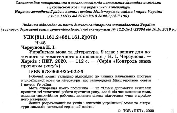 Черсунова. Українська мова та література 9 клас Зошит для поточного та тематичного оцінювання купити "Пет"