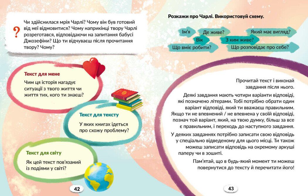 Посібник є складником навчально-методичного комплекту, розробленого на основі підручника «Українська мова та читання» для 4 класу (авторський колектив — Інна Большакова, Ігор Хворостяний). Видання покликане розширити коло читання учнівства й забезпечити системне формування вмінь працювати з різними типами текстів у реальних навчальних ситуаціях. Посібник містить завдання, укладені за зразком загальнодержавного моніторингу читацької грамотності, і пропонує роботу з художніми й інформаційними текстами різних рівнів складності.