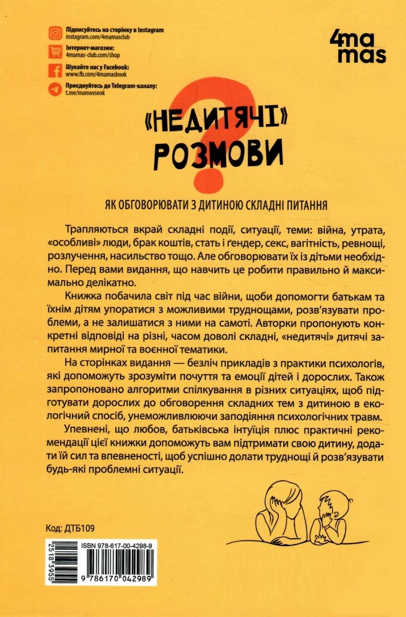 Трапляються вкрай складні події, ситуації, теми: війна, утрата, «особливі» люди, брак коштів, стать і ґендер, секс, вагітність, ревнощі, розлучення, насильство тощо. Але обговорювати їх із дітьми необхідно. Перед вами видання, що навчить це робити правильно й максимально делікатно.На сторінках видання — безліч прикладів з практики психологів, які допоможуть зрозуміти почуття та емоції дітей і дорослих. Також запропоновано алгоритми спілкування в різних ситуаціях, щоб підготувати дорослих до обговорення складних тем з дитиною в екологічний спосіб, унеможливлюючи заподіяння психологічних травм. Книжка побачила світ під час війни, щоби допомогти батькам і їхнім дітям упоратися з можливими труднощами, розв’язувати проблеми, а не залишатися з ними на самоті. Авторки пропонують конкретні відповіді на різні, часом доволі складні, «недитячі» дитячі запитання мирної та воєнної тематики. На сторінках видання — безліч прикладів з практики психологів, які допоможуть зрозуміти почуття та емоції дітей і дорослих. Також запропоновано алгоритми спілкування в різних ситуаціях, щоб підготувати дорослих до обговорення складних тем з дитиною в екологічний спосіб, унеможливлюючи заподіяння психологічних травм.Упевнені, що любов, батьківська інтуїція плюс практичні рекомендації цієї книжки допоможуть вам підтримати свою дитину, додати їй сил та впевненості, щоб успішно долати труднощі й розв’язувати будь-які проблемні ситуації.