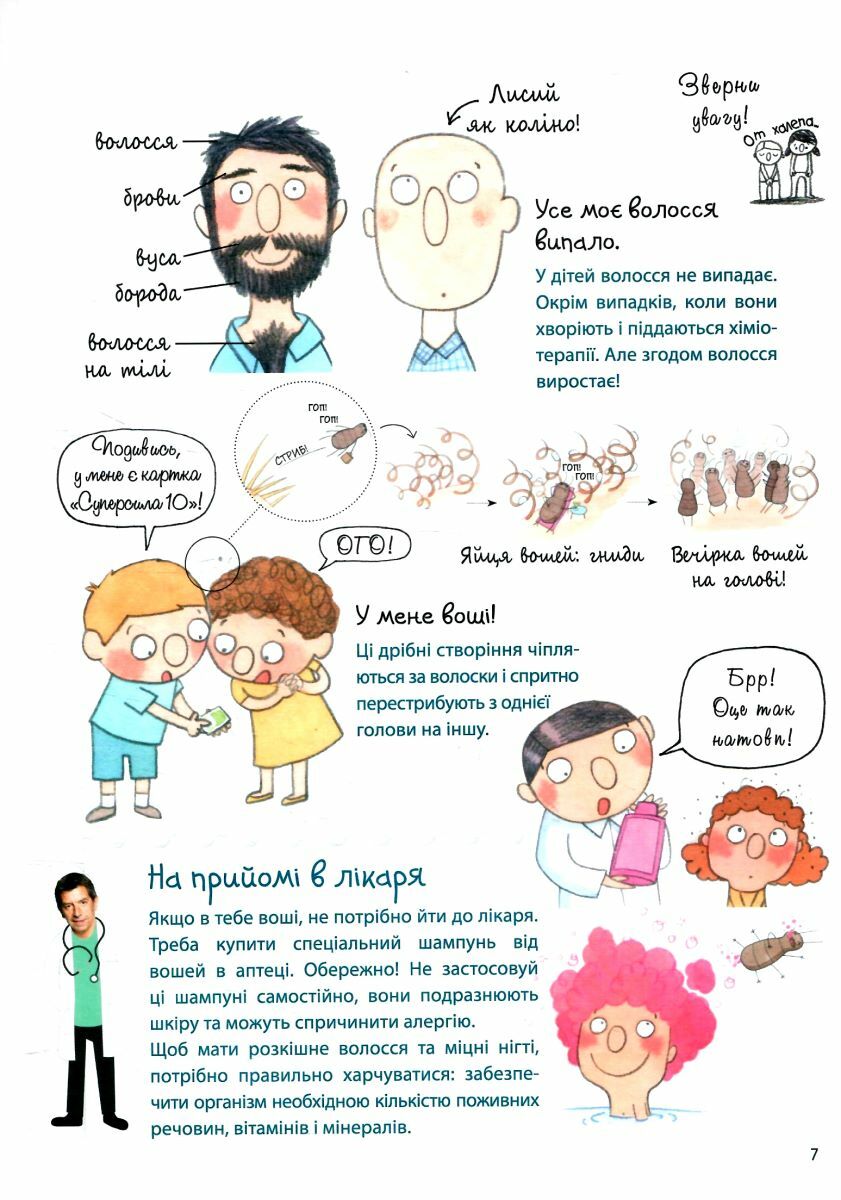 Чому іноді доводиться носити окуляри? Чому в мене світле волосся, а у моєї подружки чорне? Чому може боліти живіт? Чи це правда, що можна вилікувати горло морозивом? Скільки ж всього цікавого та невідомого відкривають діти у своєму тілі! І ось та книга, яка нарешті допоможе знайти зрозумілі та дотепні відповіді на всі запитання!Автор книги — відомий французький лікар і телевізійний ведучий Мішель Сімс, якого на створення книги надихнув 5-річний допитливий син. Книжка пояснює дітям усе про їхнє тіло. З неї вони дізнаються, які процеси та реакції нашого тіла є нормальними, а які повідомляють про те, що слід звернутися до лікаря. Рубрика «На прийомі у лікаря» особлива в цій книзі. Вона пояснює дитині, навіщо піклуватися про своє здоров’я, знайомить із різними фахівцями та допомагає подолати страх перед відвідуванням лікаря.Автор книги — відомий французький лікар і телевізійний ведучий Мішель Сімс, якого на створення книги надихнув 5-річний допитливий син.