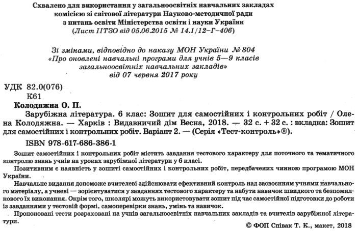 уцінка тест-контроль 6 клас зарубіжна література (затерта)
