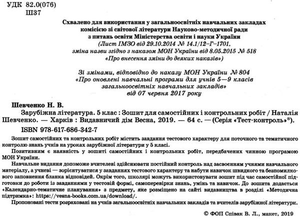 Тест-контроль 5кл Заруб.літерат 17р (оновл прогр) "Весна"