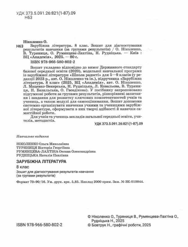 Зошит укладено відповідно до вимог Державного стандарту базової середньої освіти (2020), модельної навчальної програми із зарубіжної літератури «Школа радості» для 5—9 класів (у редакції 2023 р., авт. О. Ніколенко та ін.), підручника «Зарубіжна література. 8 клас» (2025, ВЦ «Академія», авт. О. Ніколенко, Л. Мацевко-Бекерська, Н. Рудніцька, Л. Ковальова, В. Туряниця, Н. Базильська, О. Гвоздікова). У посібнику запропоновано підсумкові роботи за групами результатів, різнорівневі запитання і завдання для розвитку ключових компетентностей учнів та учениць, а також модулі для самооцінювання. Зошит допоможе системно організувати вивчення учнями та ученицями зарубіжної літератури, сформувати в них творчі здібності й навички самостійної роботи. Для учнів та учениць закладів загальної середньої освіти, учителів, методистів.