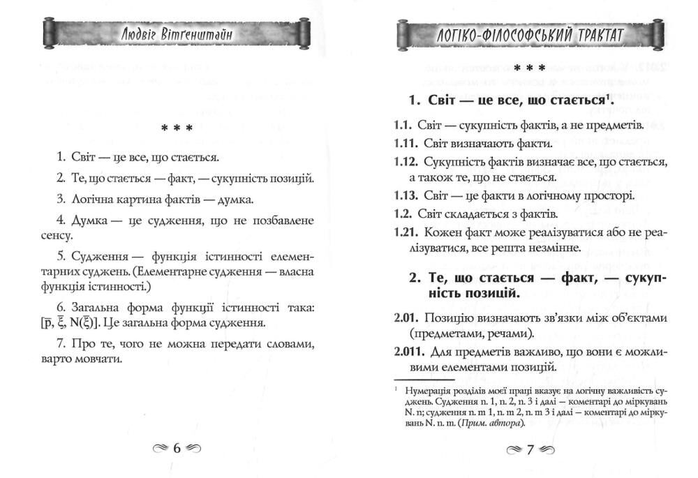 Пропоноване видання містить переклад «Логіко-філософського трактату» — фундаментальної праці австрійського філософа, одного із засновників аналітичної філософії та логічного позитивізму, Людвіга Вітґенштайна (1889–1951). Вона побачила світ 1921 року і стала однією з найвпливовіших книжок, яка надихнула мислителів XX сто ліття для подальших дискусій про природу мови, світу та меж мислення.