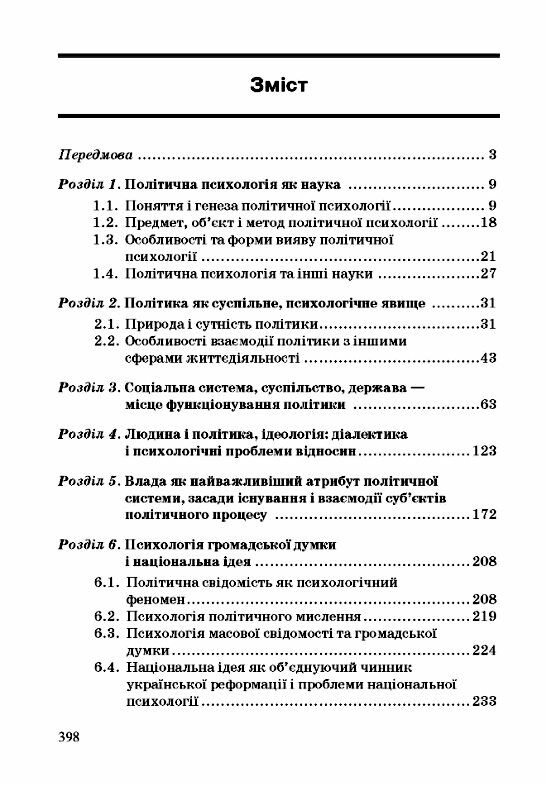 У пропонованому підручнику розглядається феномен “політична психологія” як малодосліджена і малосистематизована в Україні наукова і прикладна дисципліна. Розкриваються сутність, предмет і мета політичної психології, її структура, особливості та основні форми вивчення. Аналізуються психологічні аспекти формування громадської думки, політичної поведінки та участі, особливості формування національної елиті та ін. Для студентів, викладачів, наукових працівників і всіх, хто бажає здобути та поглибити знання у сфері політичної психології, політики взагалі.