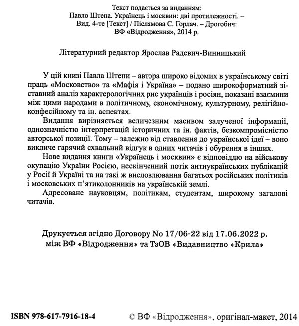 У цій книзі Павла Штепи - автора широко відомих в українському світі праць «Московство» та «Мафія і Україна» - подано широкоформатний зіставний аналіз характерологічних рис українців і росіян, показані взаємини між цими народами в політичному, економічному, культурному, релігійно-конфесійному та ін. аспектах.