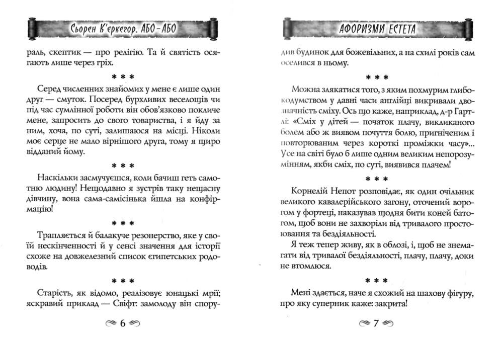 Це видання знайомить із творчістю відомого данського філософа, лютеранського теолога, поета, соціального критика та релігійного письменника Сьорена К’єркегора (1813–1855), якого вважають першим філософом-екзистенціалістом. Трактат «Або – Або» (1843) — перший із опублікованих творів Сьорена К’єркегора, який він написав під псевдонімом і який приніс йому славу. До цієї збірки увійшли п’ять фрагментів цього трактату: «Афоризми естета», «Силуети тіней», «Найнещасніший», «Сівозміна» та знаменитий «Щоденник спокусника». Автор висловлює погляди двох різних постатей із радикально різними переконаннями, розмірковує над пошуком смислового існування, над темами вибору та обов’язку, насолоди та відповідальності, шлюбу та свободи, драми, нудьги та відчаю, цинічного спокушання та відторгнення юної красивої дівчини. Ця книга — не просто філософський трактат, а емоційна подорож у внутрішній світ людини, яка шукає сенси життя.